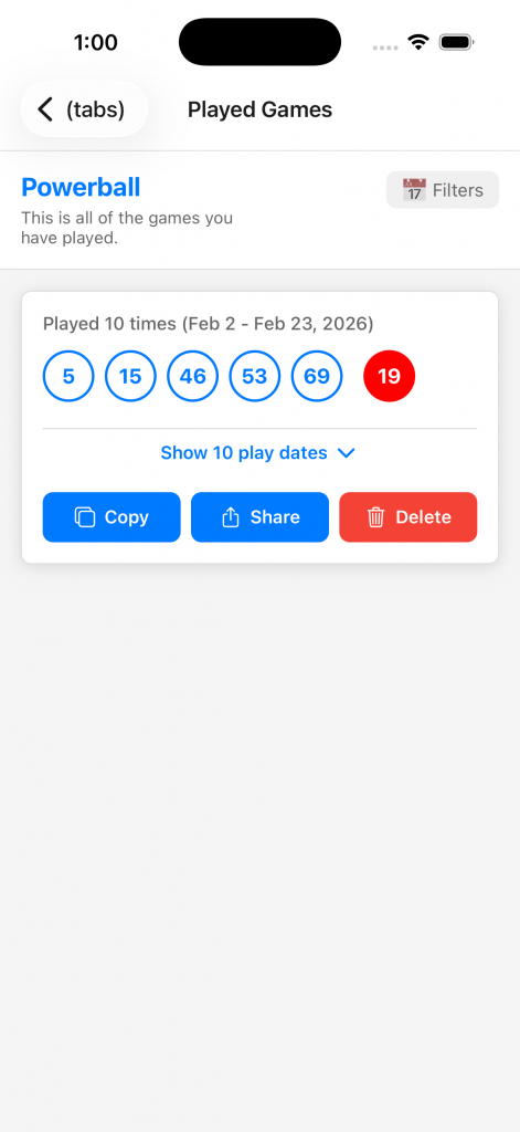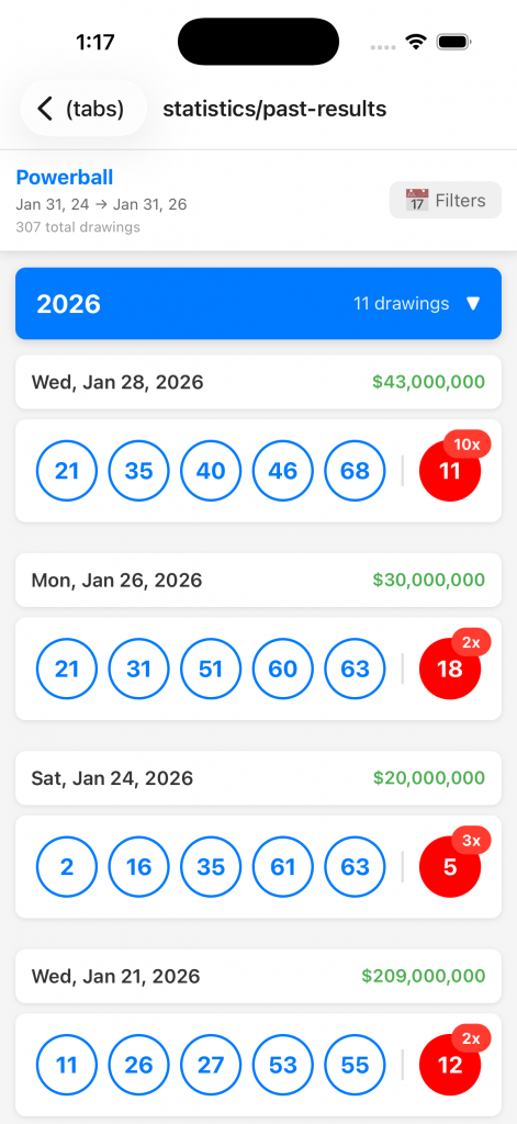 - Powerball: All drawings from October 2015 to present (when format changed to 1-69 + 1-26)