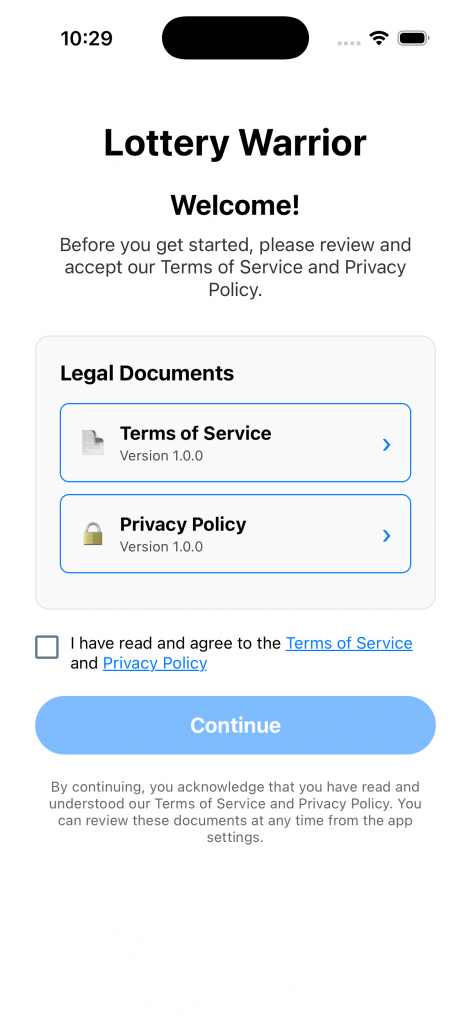 Before using Lottery Warrior, you must accept our Terms of Service and Privacy Policy. This is a one-time requirement on first launch.